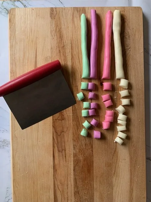 5. Roll the dough out into 1/4 inch thick ropes. Cut into small pieces then spread out onto a parchment lined cookie sheet. Let the mints dry out for a few hours/overnight at room temperature.